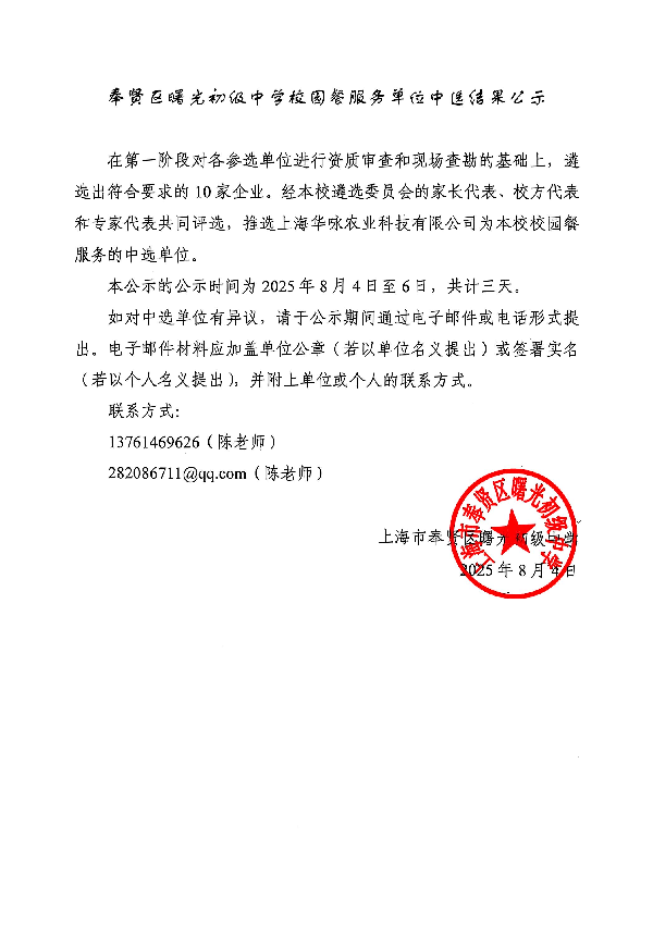 奉贤区曙光初级中学校园餐服务单位中选结果公示