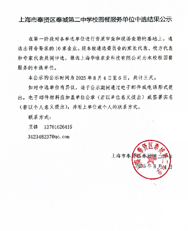 上海市奉贤区奉城第二中学校园餐服务单位中选结果公示