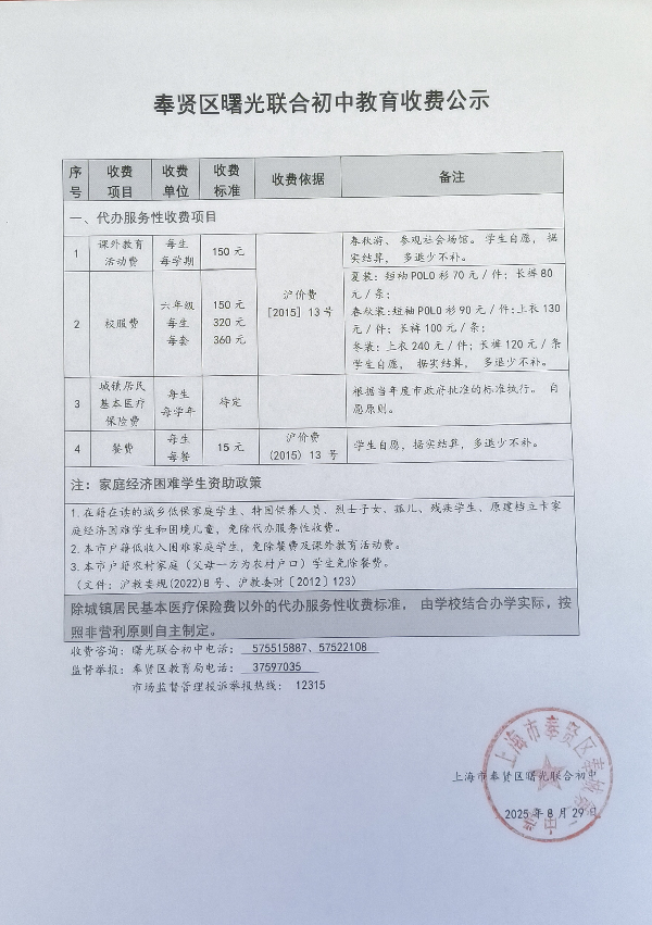 奉贤区曙光初级中学校园餐服务单位中选结果公示