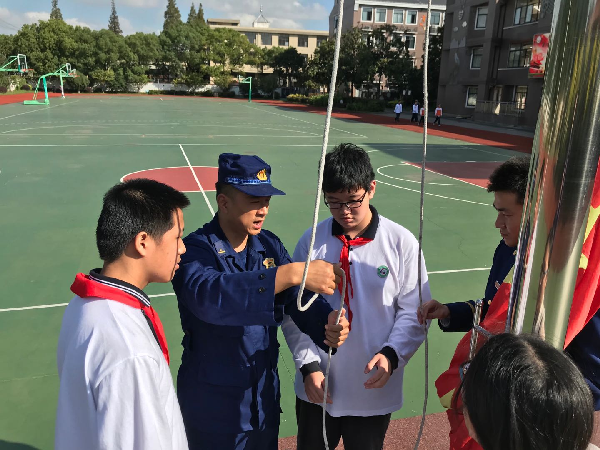 (通讯员 吴玥)10月10日,学校邀请了奉城消防中队的消防战士为国旗班的六位队员进行了升护旗的培训,国旗班的六位队员在消防战士的指导下进行训练,从走正步、齐步走到擎旗、护旗、升旗、降旗、收旗等,系统学习升旗仪式动作和程序、升旗仪式规范等内容。经过这次培训,学校国旗班的六位队员对国旗有了更深刻的了解,增强了国家观念,也将激励他们争做坚强、有担当的好少年。