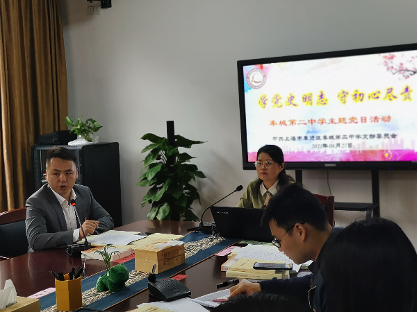 (通讯员 王珉敏)4月27日,奉城第二中学全体党员参加了“学党史明志,守初心尽责”党史学习教育动员大会,会议由党支部书记金爱群主持。